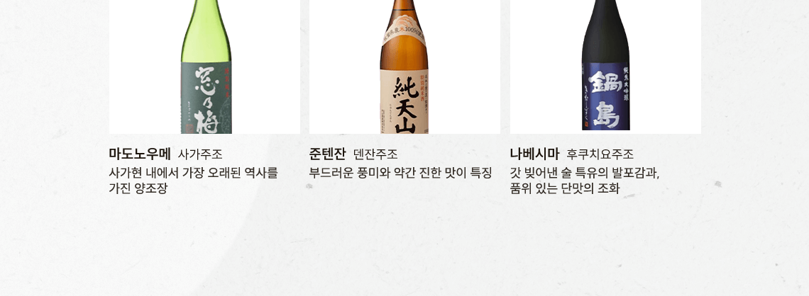 - 나베시마(후쿠치요주조) : 갓 빗어낸 술 특유의 발포감과 품위 있는 단맛의 조화