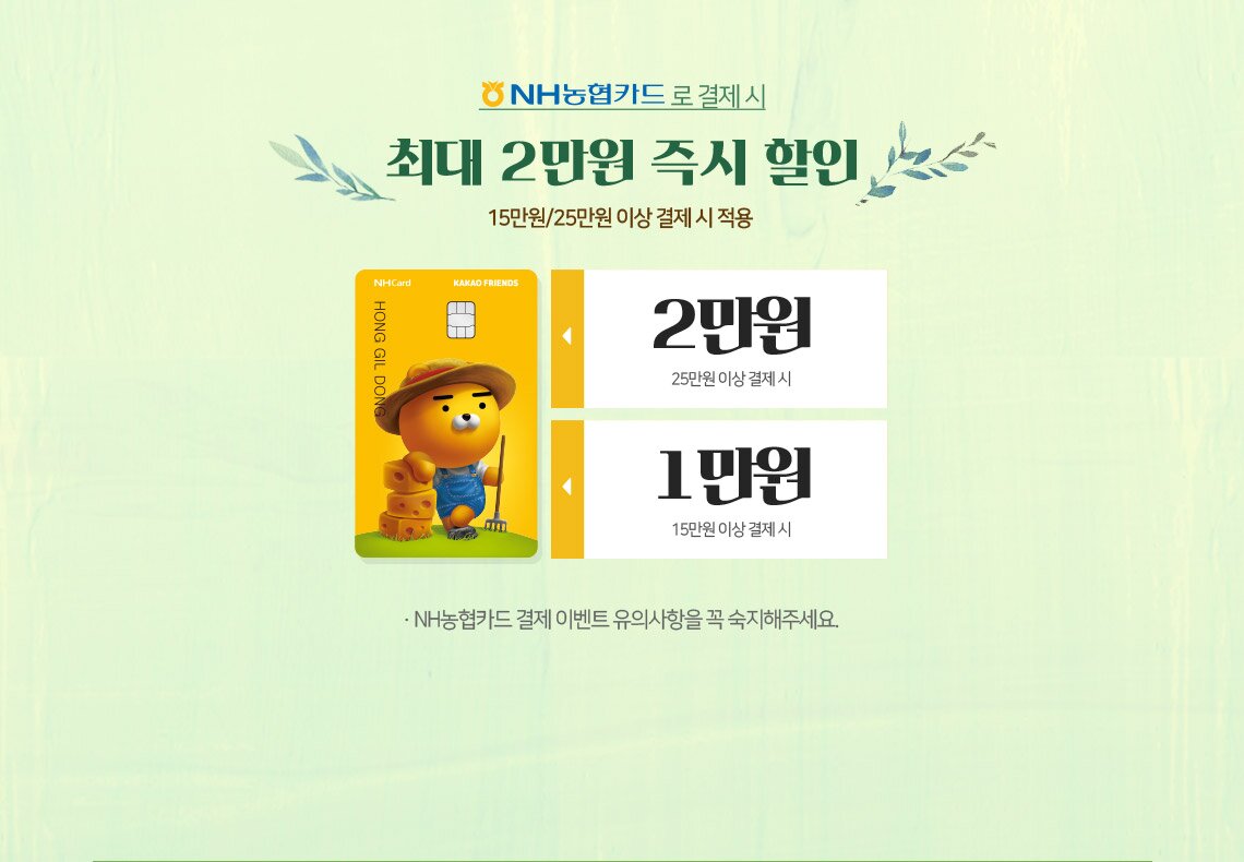 - NH농협카드 결제 할인에 대한 자세한 내용은 NH농협카드 이벤트 페이지에서 확인 부탁 드립니다. [자세히 보기 ▷]