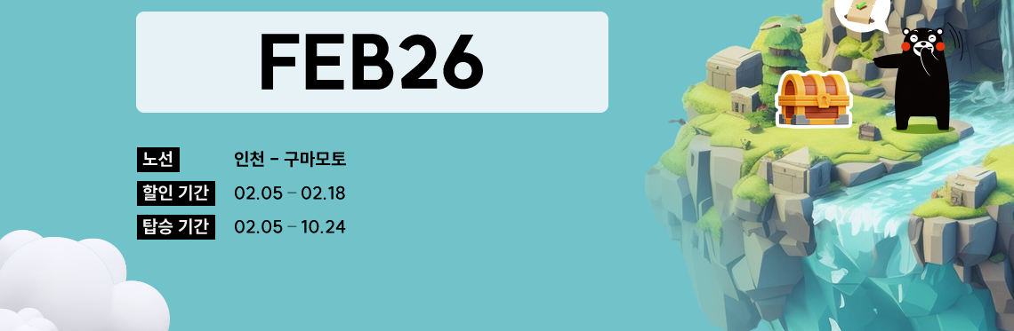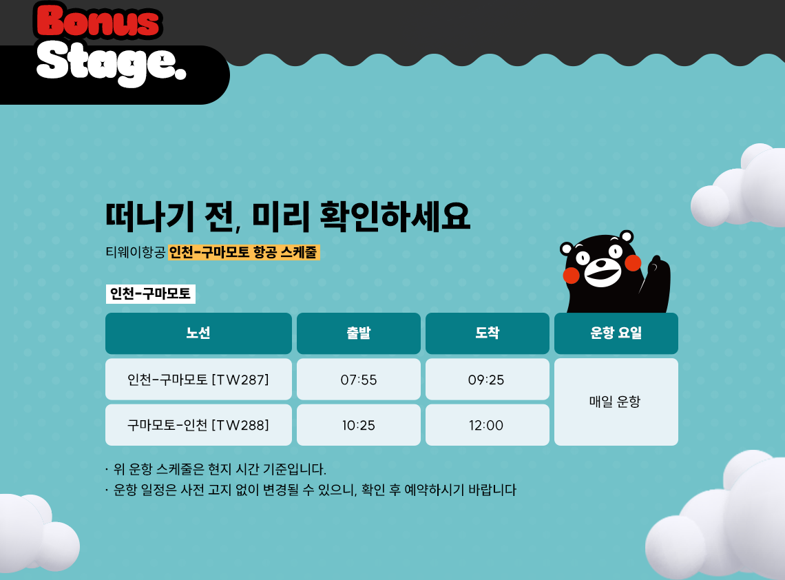 인천-구마모토 [TW287] 07:55 출발 09:25 도착 매일 운항