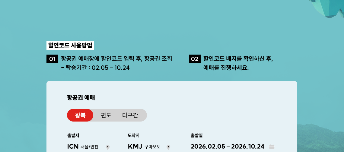- 할인 코드 특가는 출발 공항을 한국(인천)으로 선택 후 편도/왕복 예약 시에만 적용됩니다. (출발 공항을 해외로 선택 시 적용 불가)