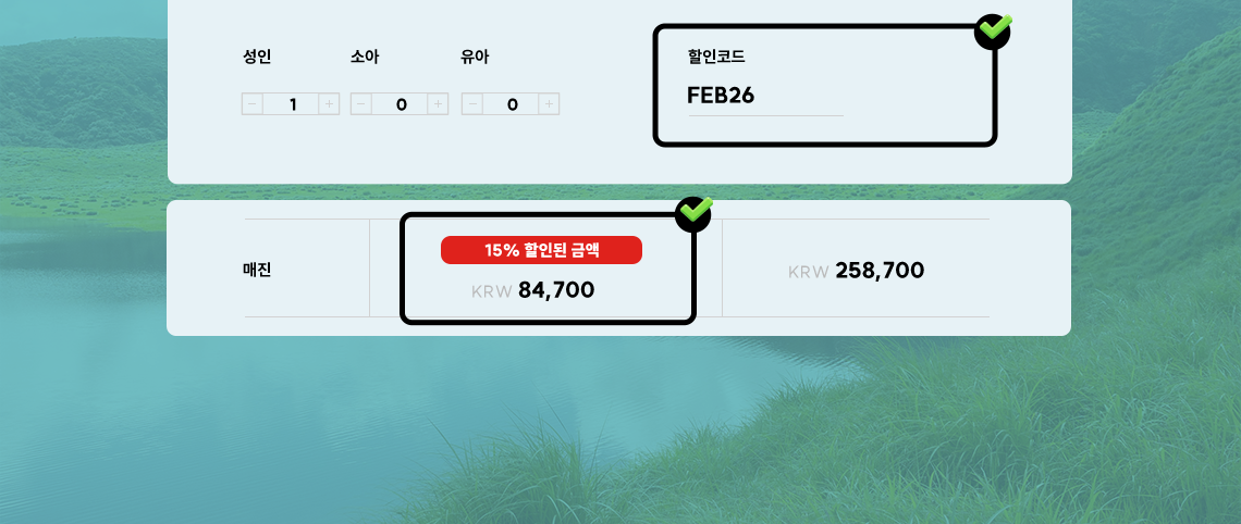 - 할인코드는 유류할증료와 공항시설 사용료를 제외한 항공 운임에서 할인됩니다.