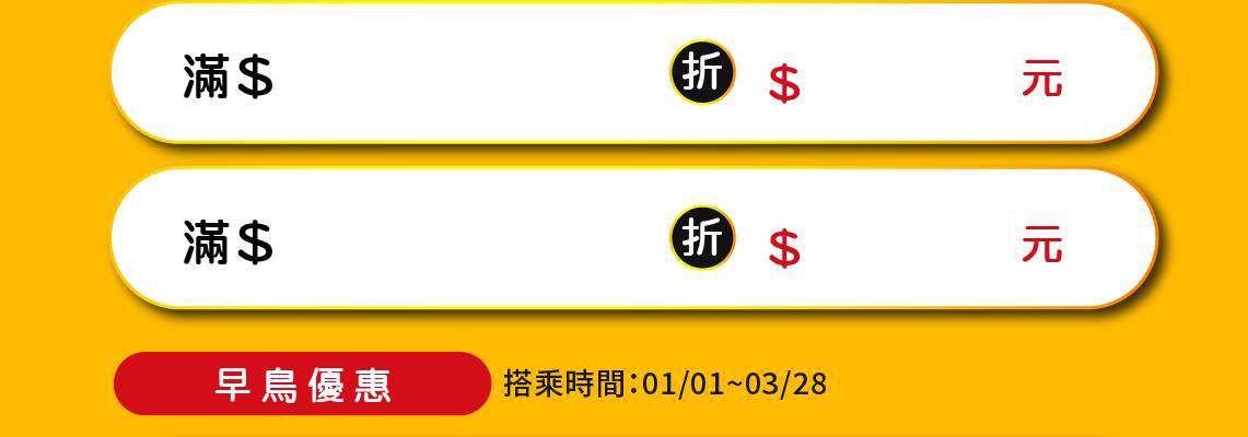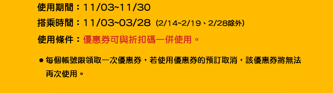 - 根據營業政策,各路線搭乘的期間可能會有無法使用該優惠的日期,敬請見諒。