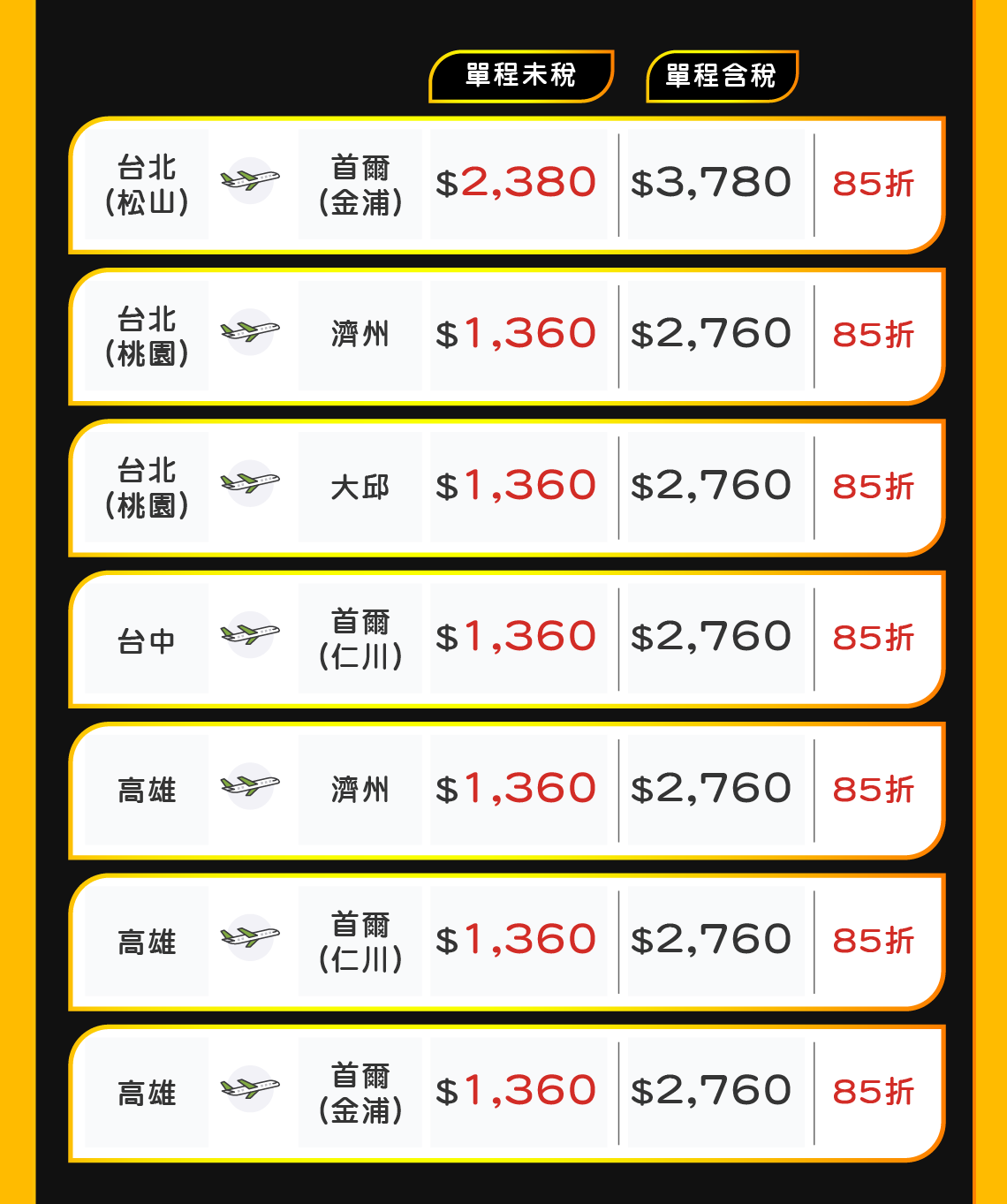 - 根據營業政策,各航線搭乘的期間中,可能會有不適用該特價票價的日期,敬請見諒。