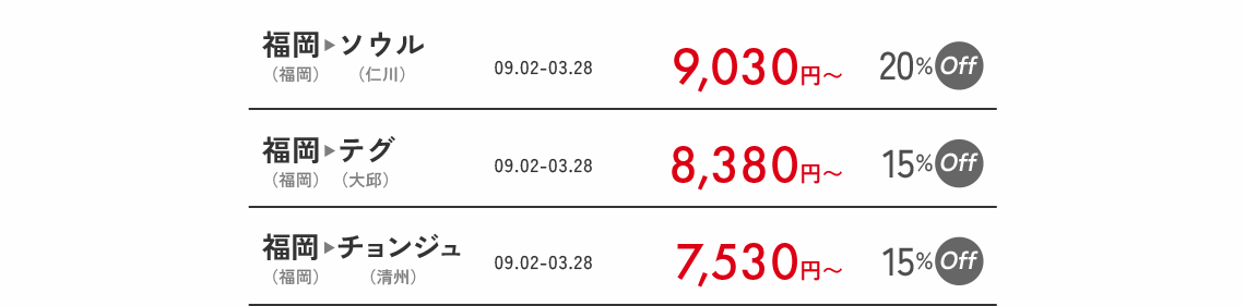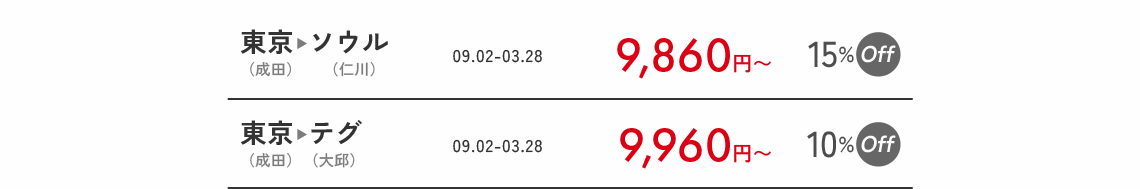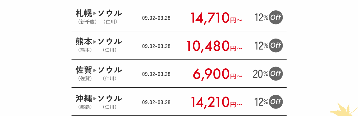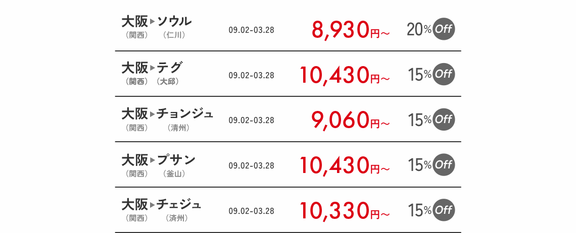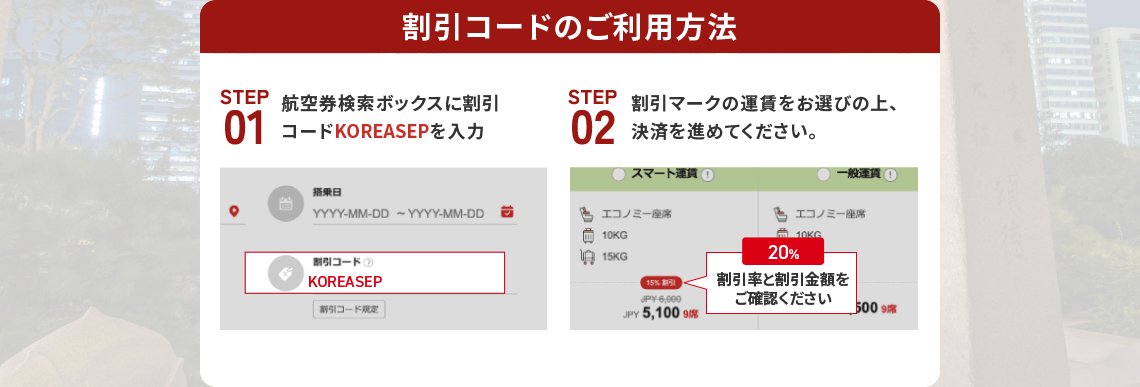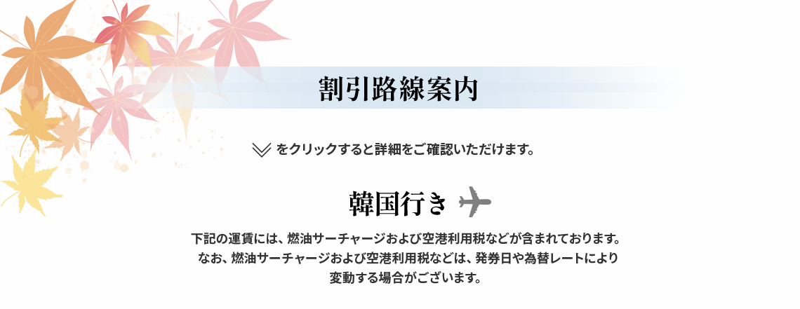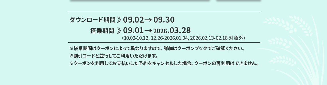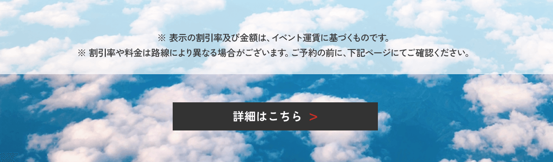 - 営業ポリシーにより、路線別の搭乗期間中に該当割引コードが適用されない日付も発生することがありますので、ご了承ください。