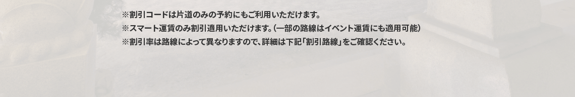 - 割引コードはスマート運賃のみご利用いただけます。(ただし、一部の路線はイベント運賃にも適用可能)
