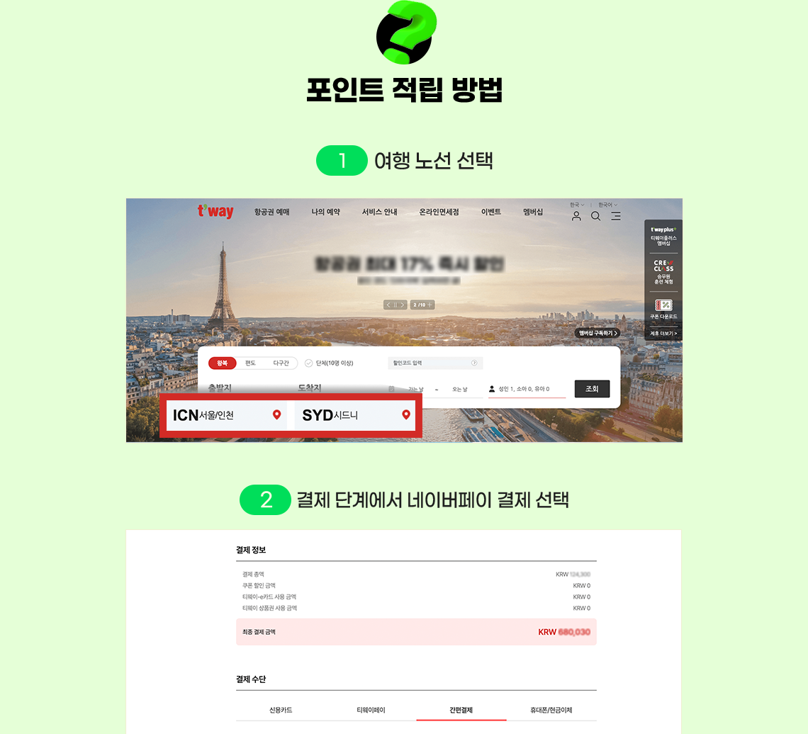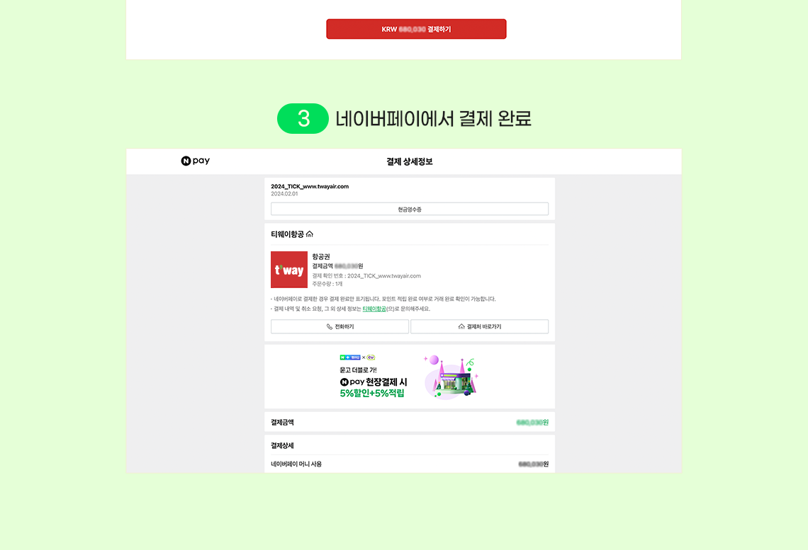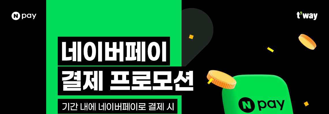 - 할인 쿠폰 및 포인트 적립은 티웨이항공 홈페이지(PC/모바일 웹/모바일 앱)에서 네이버페이로 결제 시에 적용 가능합니다.