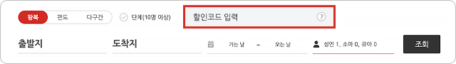 항공권 예매 창에 할인코드 입력 후, 항공권 조회 (탑승 기간: 24/11/22~25/3/29)