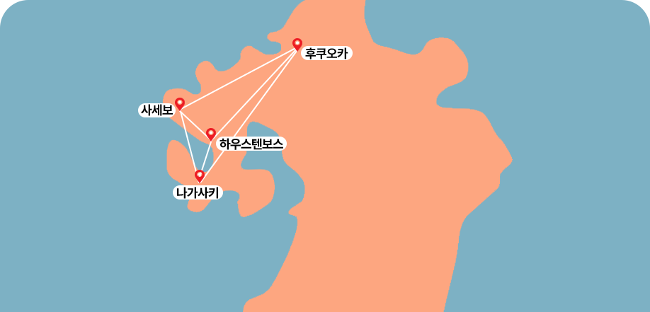*본 티켓으로 각 구간을 1번씩 탑승 가능합니다. 후쿠오카 ↔ 나가사키나가사키 ↔ 사세보/하우스텐보스 사세보 ↔ 하우스텐보스 사세보/하우스텐보스 ↔ 후쿠오카 |