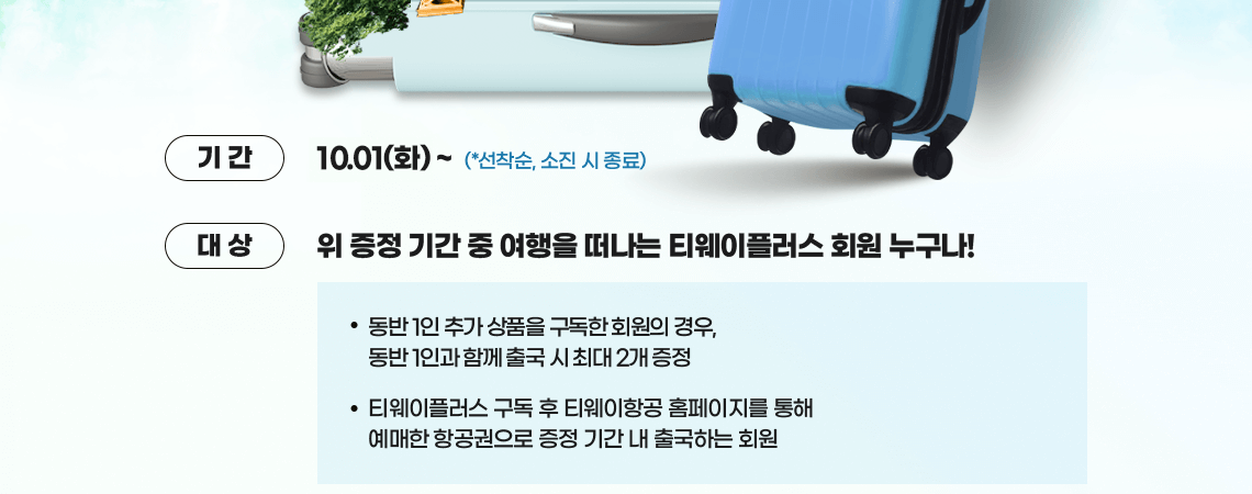 - 대상 : 위 증정 기간 중 여행을 떠나는 티웨이플러스 회원 누구나! 동반 1인 추가 상품을 구독한 회원의 경우, 동반 1인과 함께 출국 시 최대 2개 증정 티웨이플러스 구독 후 티웨이항공 홈페이지를 통해 예매한 항공권으로 증정 기간 내 출국하는 회원