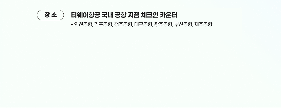 - 장소 : 티웨이항공 국내 공항 지점 체크인 카운터 -인천공항, 김포공항, 청주공항, 대구공항, 광주공항, 부산공항, 제주공항