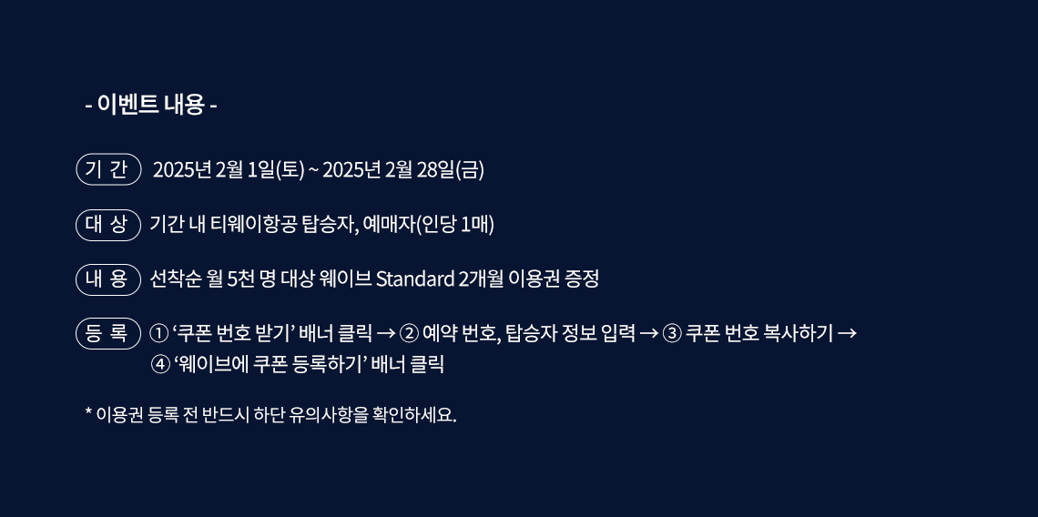 - 등록:①'쿠폰 번호 받기'배너 클릭 → ②예약 번호, 탑승자 정보 입력 → ③쿠폰 번호 복사하기 → ④'웨이브에 쿠폰 등록하기'배너 클릭