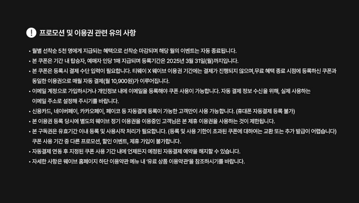 - 자세한 사항은 웨이브 홈페이지 하단 이용약관 메뉴 내 ‘유료 상품 이용약관’을 참조하시기를 바랍니다.