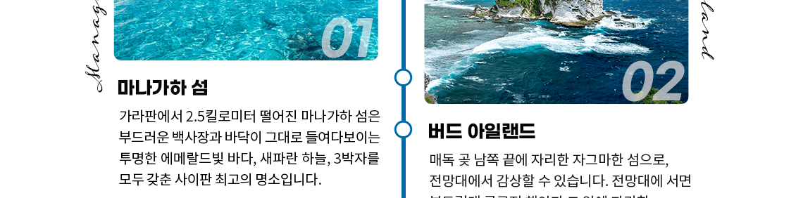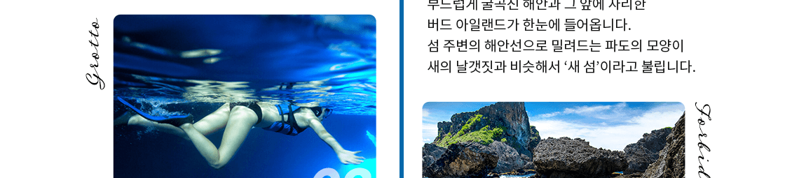 - 포비든 아일랜드(Forbidden Island) : 포비든 아일랜드는 이름 그대로 '금지된 섬'입니다. 새와 바다거북, 소라게 등 희귀 동식물의 서식지인 자연보호구역으로 지정돼 평소에는 출입을 금지하며 부정기적으로 일반인에게 공개합니다. 짙푸른 바다빛과 둥글게 감싸 안은 해안선이 독특한 분위기를 자아냅니다.