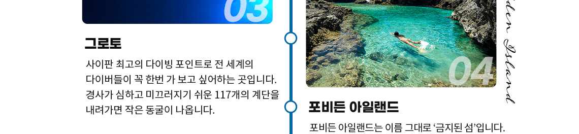 - 그로토 (Grotto) : 사이판 최고의 다이빙 포인트로 전 세계의 다이버들이 꼭 한번 가 보고 싶어하는 곳입니다. 경사가 심하고 미끄러지기 쉬운 117개의 계단을 내려가면 작은 동굴이 나옵니다.