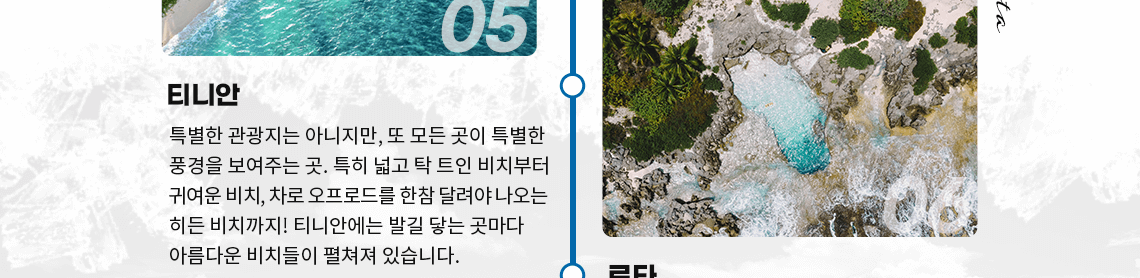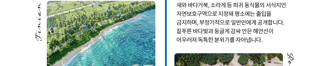 - 티니안 (Tinian) : 특별한 관광지는 아니지만, 또 모든 곳이 특별한 풍경을 보여주는 곳. 특히 넓고 탁 트인 비치부터 귀여운 비치, 차로 오프로드를 한참 달려야 나오는 이든 비치까지! 티니안에는 발길 닿는 곳마다 아름다운 비치들이 펼쳐져 있습니다.