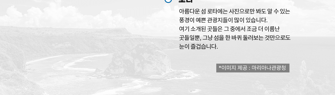 - 로타 (Rota) : 아름다운 섬 로타에는 사진으로만 봐도 알 수 있는 풍경이 예쁜 관광지들이 많이 있습니다. 여기 소개된 곳들은 그 중에서 조금 더 이름난 곳들일뿐, 그냥 섬을 한 바퀴 둘러보는 것만으로도 눈이 즐겁습니다.