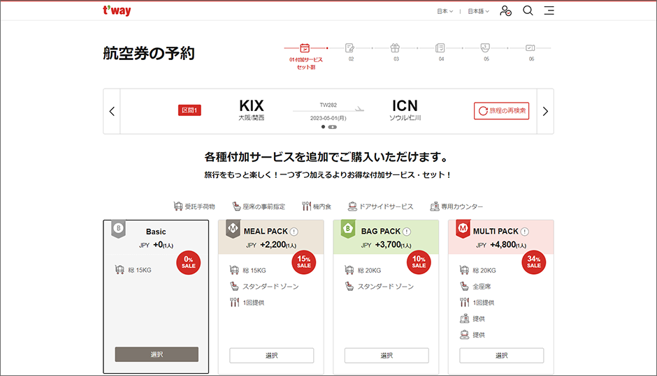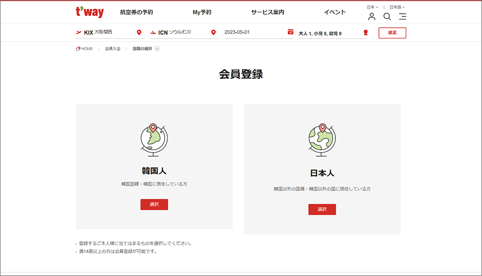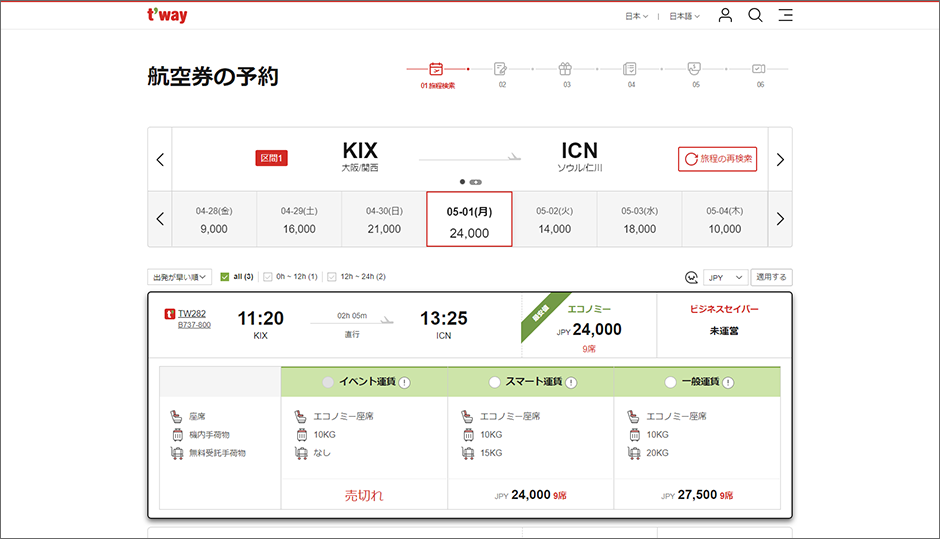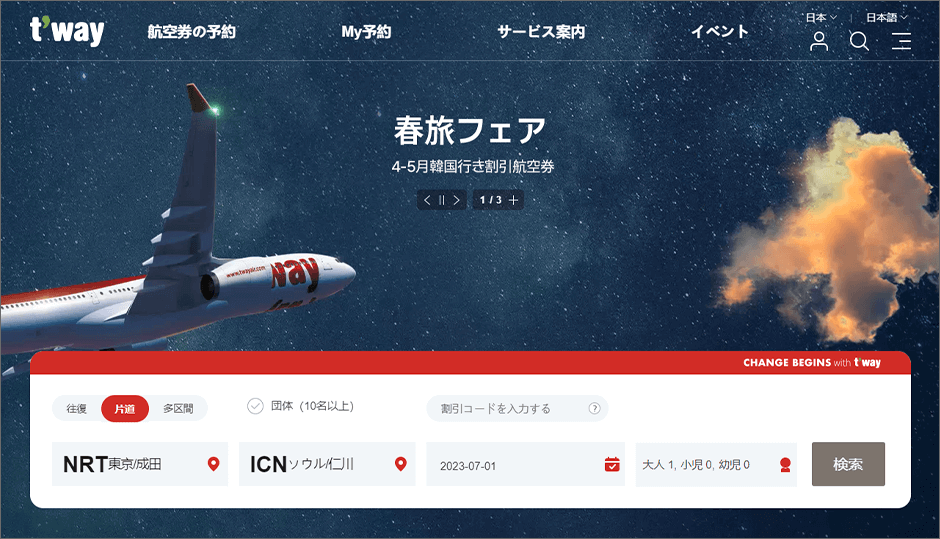 成田-ソウル(仁川) | 成田-テグ(大邱) | 関西-ソウル(仁川) | 関西-テグ(大邱) |