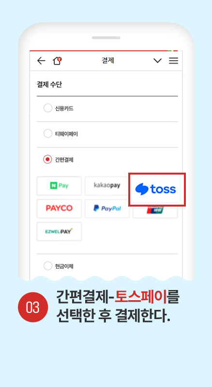 - 토스 간편결제 선택 시에만 할인이 적용되며 토스페이 이외의 간편결제수단 (네이버페이, 카카오페이, 차이, 페이코 등) 이용 이용 혹은 신용카드 선택 시에는 적용이 불가능합니다.