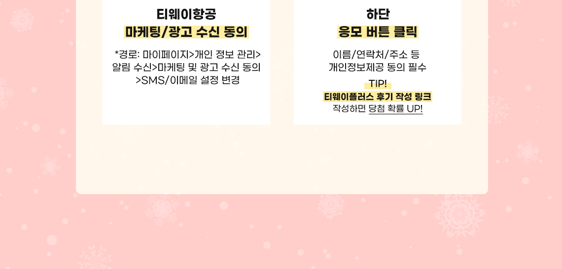 - STEP 2: 하단 응모 버튼 클릭 (이름/연락처/주소 등 개인정보제공 동의 필수), tip 티웨이플러스 후기 작성 링크 작성하면 당첨 확률 UP!