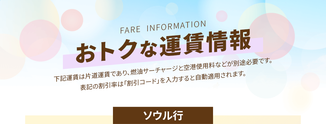 下記運賃は片道運賃であり、燃油サーチャージと空港使用料などが別途必要です。 表記の割引率は「割引コード」を入力すると自動適用されます。ソウル行