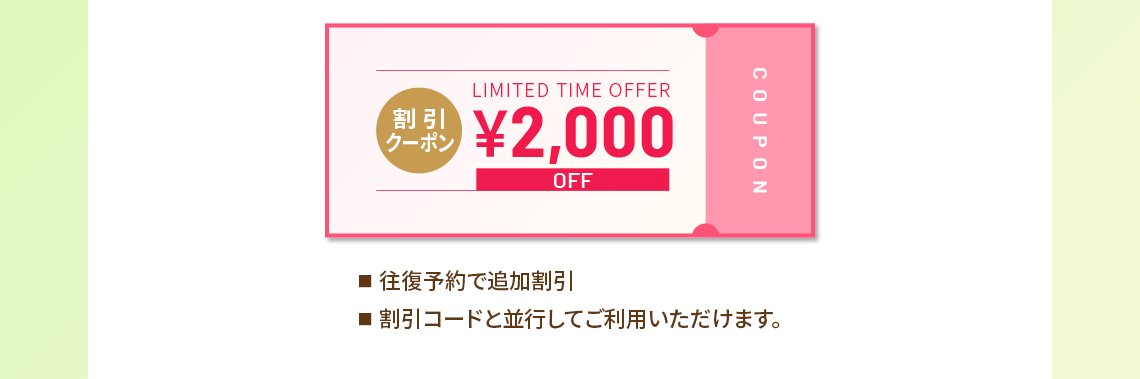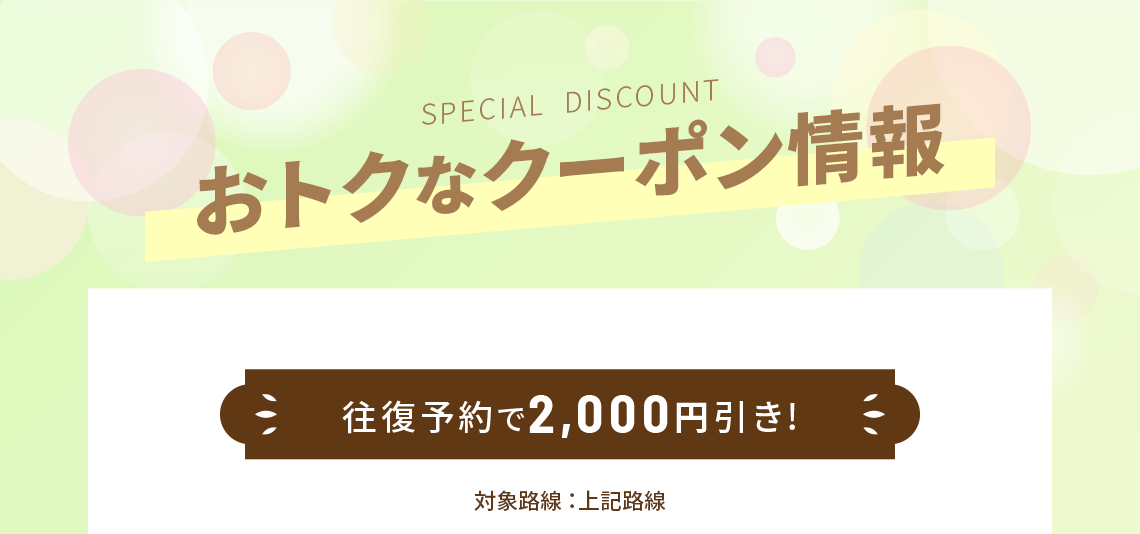 往復予約で2,000円引き! 対象路線 :上記路線- 割引クーポン