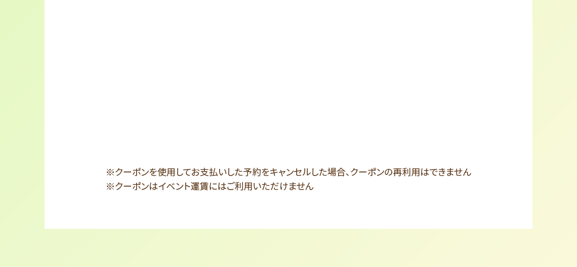 - ※ クーポンを利用した予約をキャンセルされた場合でも、一度利用したクーポンは返却されませんのでご注意ください。