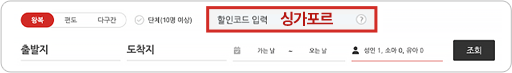 - 할인코드 특가는 출발 공항을 한국(인천,대구,부산,제주,청주)으로 선택 후 편도/왕복 예약 시에만 적용됩니다. (출발 공항을 해외로 선택 시 적용 불가)