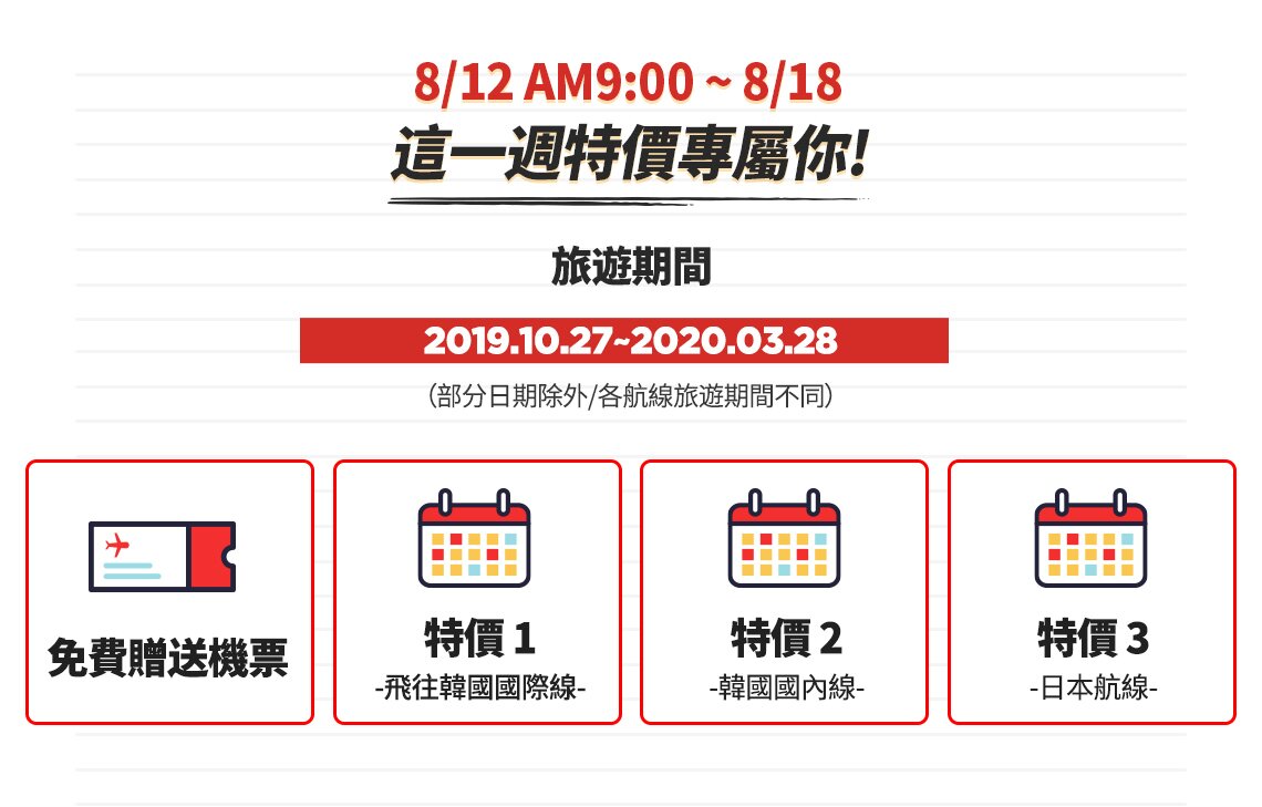 - 免費機票的航線與機票購買者以同一航線贈送,部分日期除外。