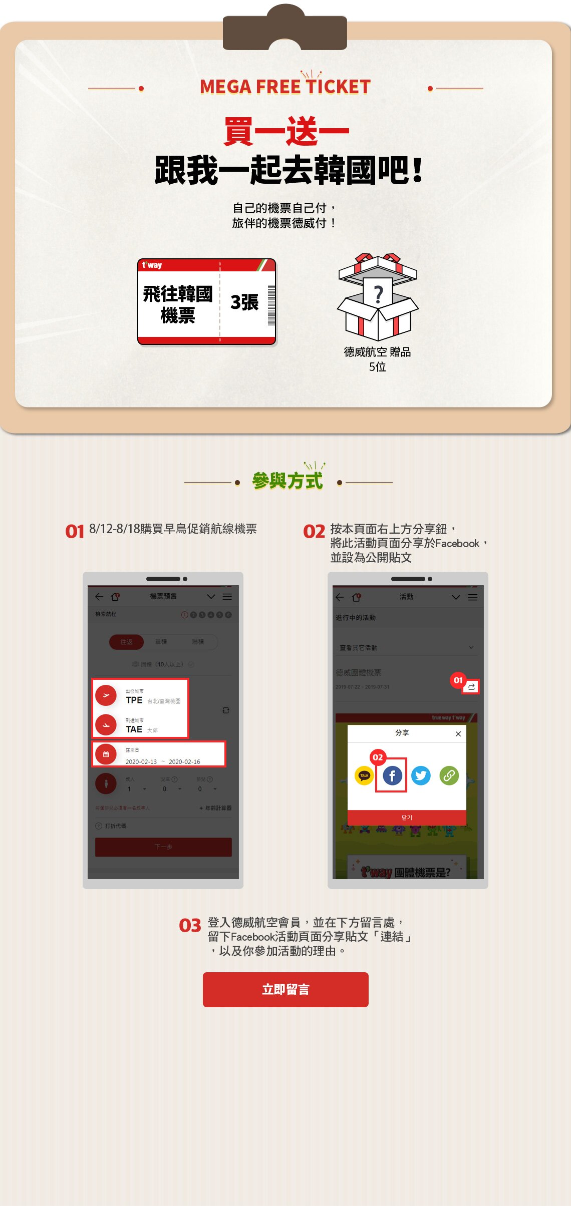 - 贈送對象:購買MEGA EARLYBIRD機票並參與Facebook留言活動的顧客當中,小編隨機挑選得獎者。 (1人 1張)