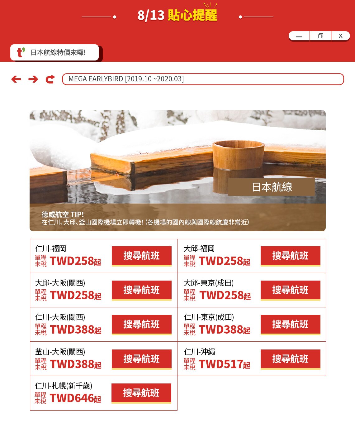 - 預定僅限在我們的官網電腦版、手機板網頁(m.twayair.com)和手機APP提供。