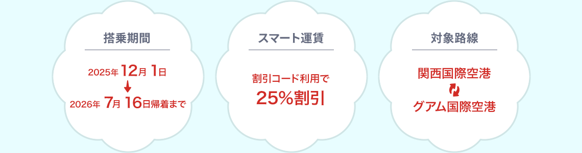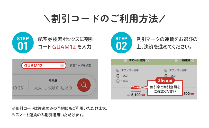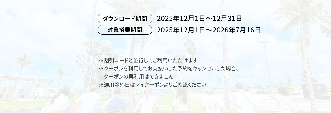 - 営業ポリシーにより、路線別の搭乗期間中に該当割引コードが適用されない日付も発生することがありますので、ご了承ください。