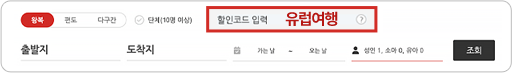 - 할인 코드 특가는 출발 공항을 한국(인천,대구,부산,제주,청주)으로 선택 후 편도/왕복 예약 시에만 적용됩니다. (출발 공항을 해외로 선택 시 적용 불가)