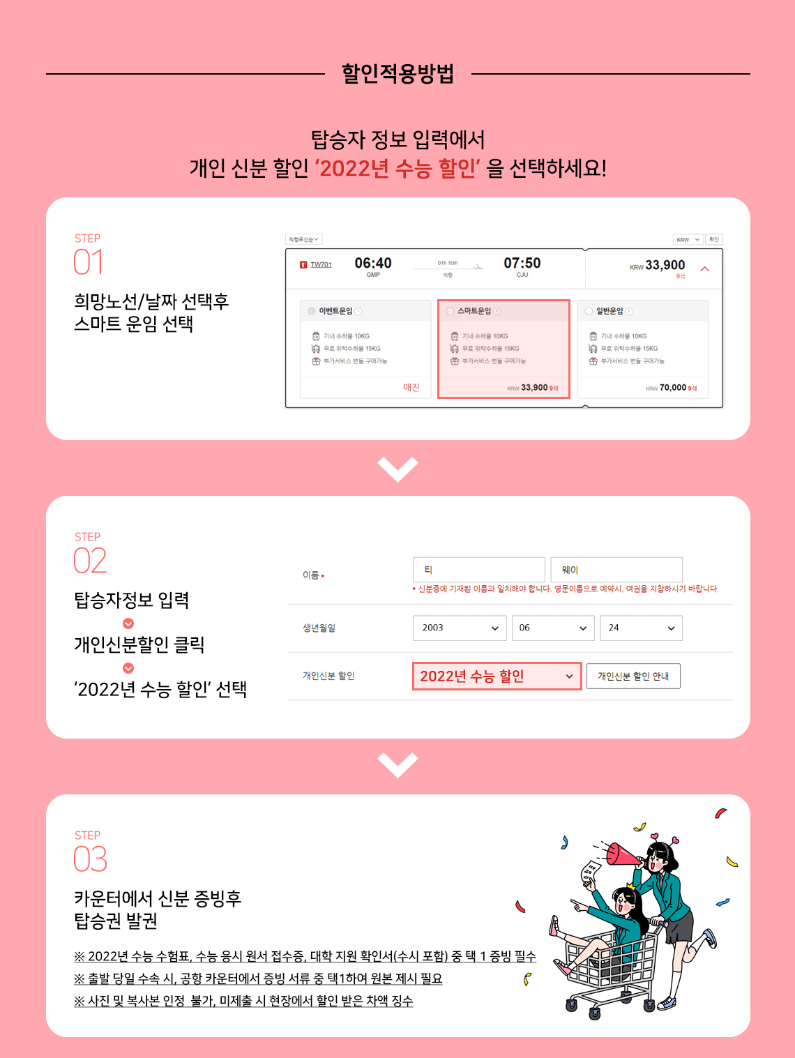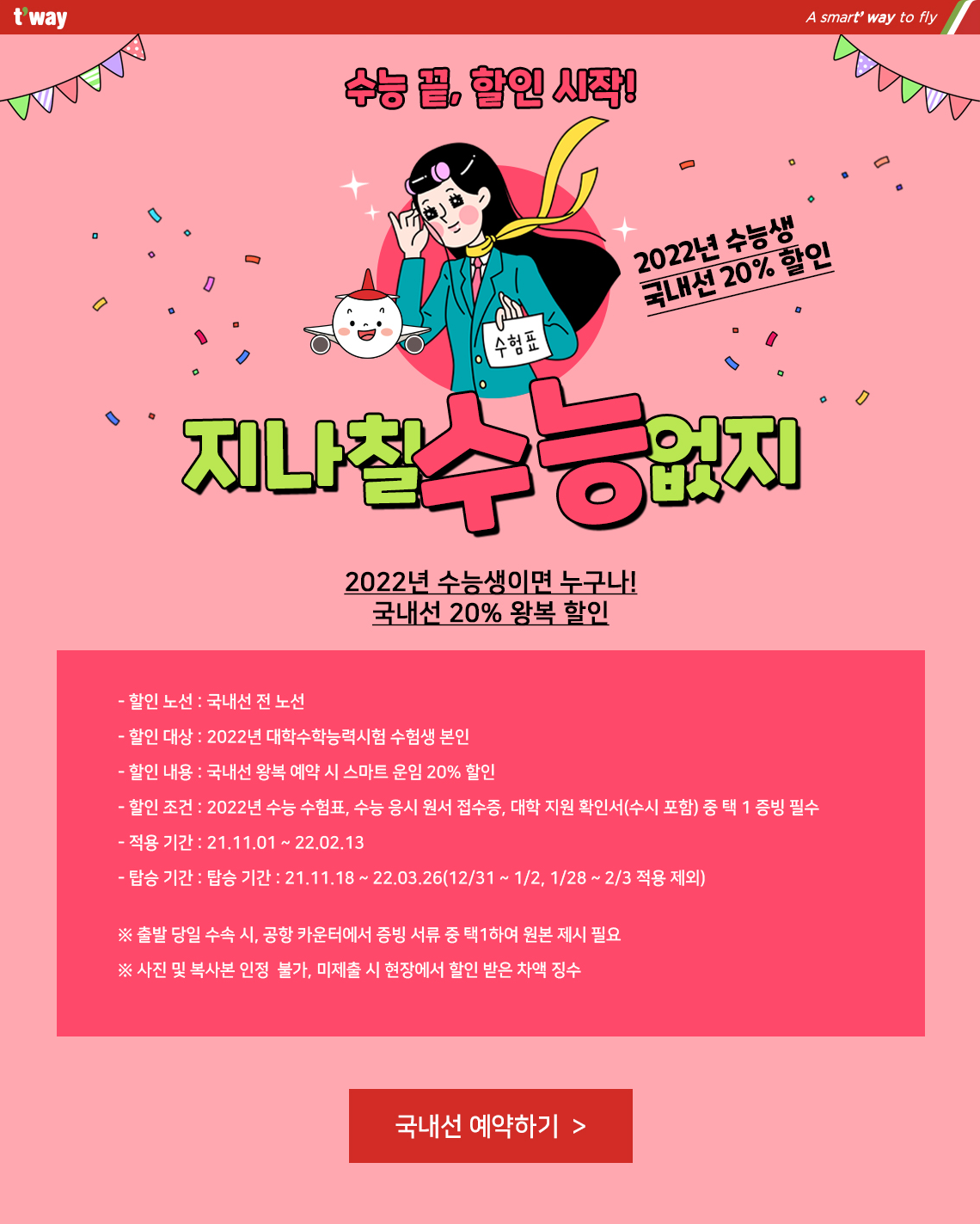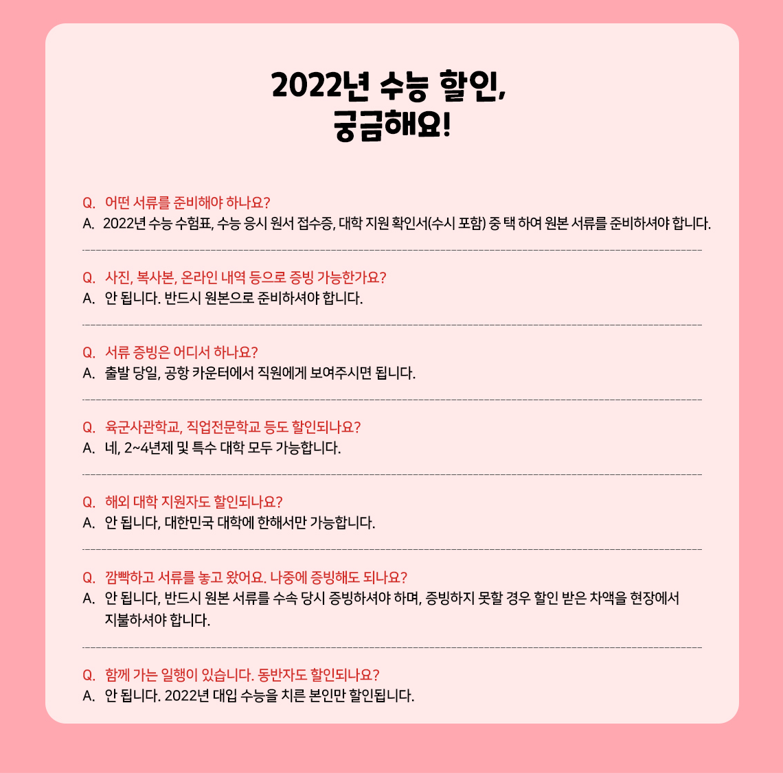 - 일부 항공편에서 수능 할인 적용 시보다 낮은 탄력적 할인 운임으로 판매되는 경우가 발생할 수 있으니 참고바랍니다.